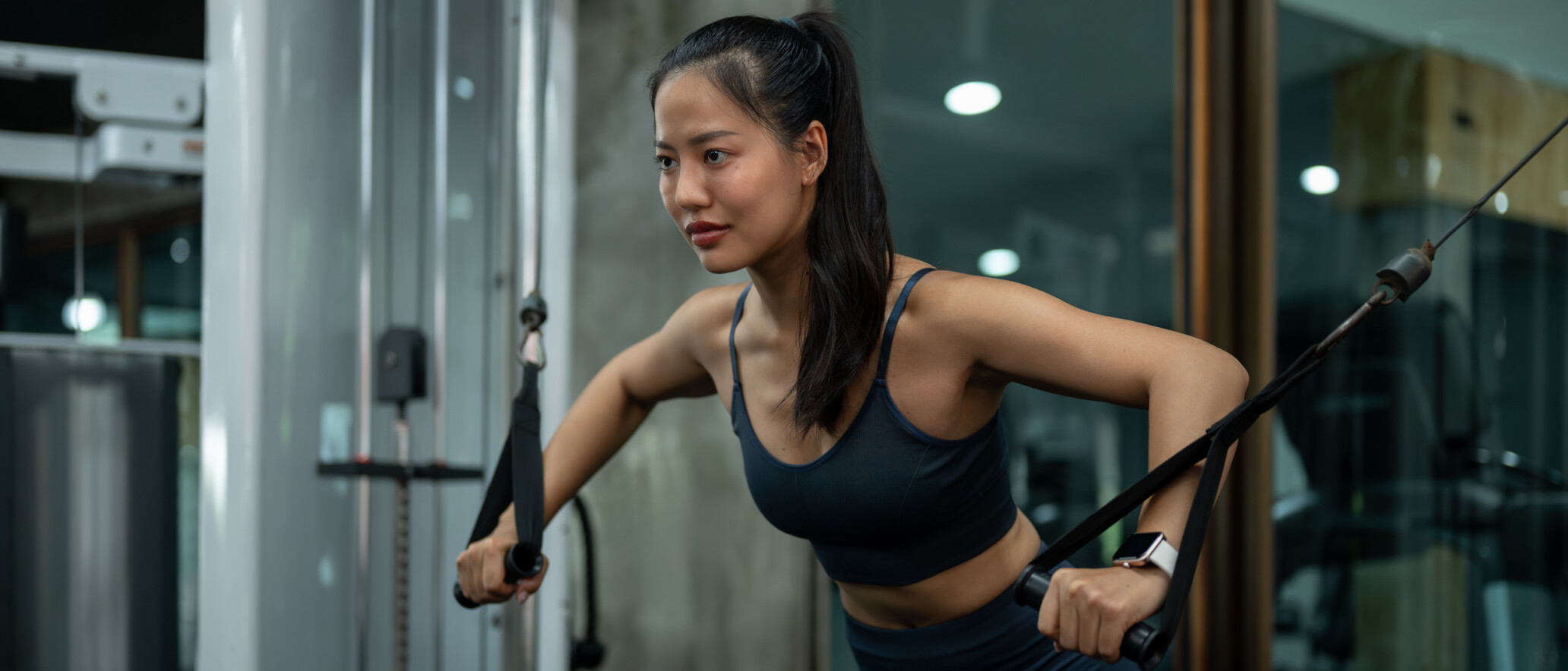 - Hold handles, step back, and pull toward your torso while squeezing shoulder blades.